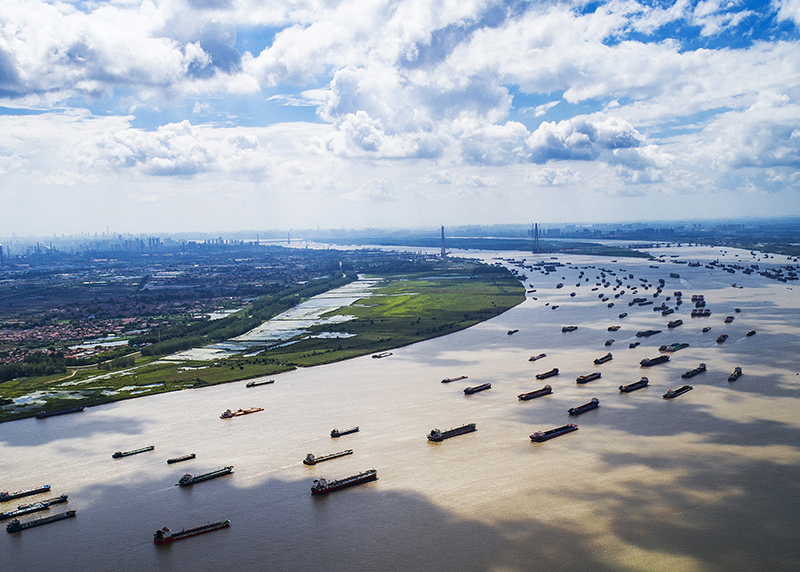 船舶在湖北省武漢市陽邏港區水域行駛(2018年8月13日攝,無人機照片)。新華社記者 肖藝九 攝