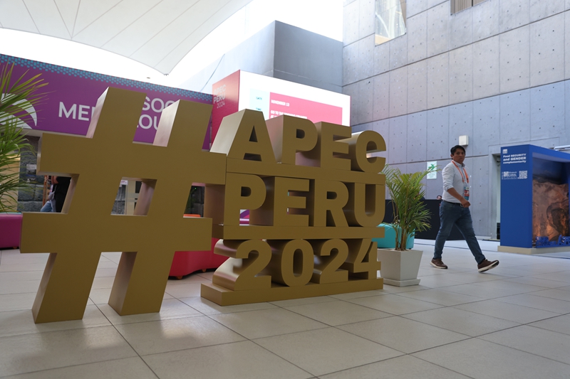11月13日,人們從秘魯首都利馬會議中心外的2024年亞太經(jīng)濟(jì)合作組織(APEC)會議標(biāo)識前走過。新華社發(fā)(瑪麗安娜·巴索 攝)