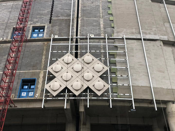 碗狀GRC板表面采用灰色拉槽雕鑿面處理, 該板塊造型大方,線條流暢,紋飾清高典雅,給人以素靜的美感。